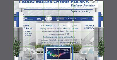 Visualization created for Bodo Moller Chemie Polska. A large space, a combination of white with a grenade and an interesting form. A professional exhibition space that will work great at trade fairs.