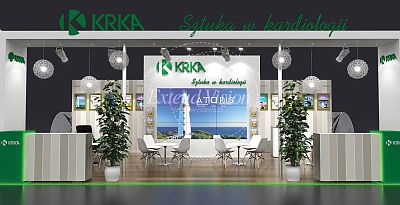 An example of the original implementation of the so-called island stand for the KRKA company. Compositions incorporated in the structure of the exhibition space equipped with functional lighting create a unique atmosphere. Noteworthy is the company's reception counter and plant motifs that coloristically refer to the company's logo. The wooden, illuminated floor sets the stand at the fair and makes it very attractive.