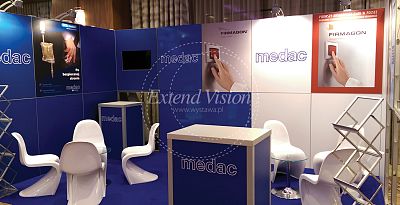 Zabudowa systemowa oparta na aluminiowych profilach. To właśnie z nich stworzyliśmy ścianki z grafiką w kolorach bieli i granatu. Nasi specjaliści nawet na niezbyt dużej przestrzeni potrafią zmieścić dwie strefy do rozmów w postaci standardowych trybunek. Stoiska systemowe są idealnym rozwiązaniem przy ich samodzielnym montażu i demontażu.